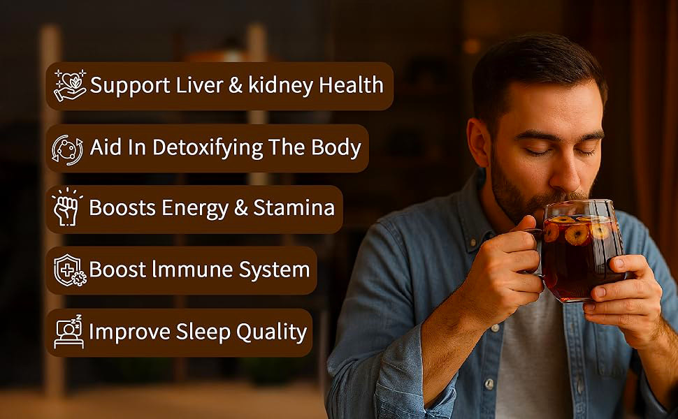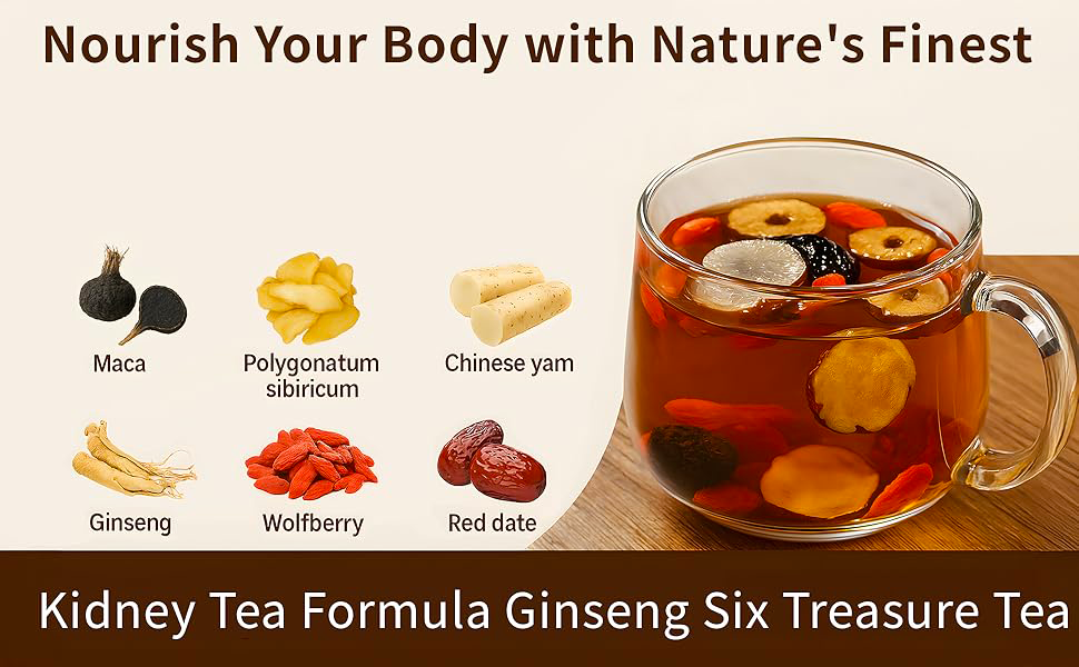 ·NATURAL INGREDIENTS:Our Kidney Tea formula is made from carefully selected ginseng, goji berries, red dates, mulberries, yam and maca, scientifically proportioned and naturally dried without any additives, caffeine or sugar, you can be assured of using these ingredients.·SUPPORTS KIDNEY HEALTH:Particularly suitable for those with busy lifestyles, it is designed to boost immunity and balance body functions.·It not only nourishes the kidneys, but also relieves fatigue and improves sleep quality. It nourishes Yin and kidneys, gives you energy and makes your body 10 years younger·Delicious Taste:Kidney Tea Formula Ginseng Six Treasure Tea has a mellow flavor and sweet aftertaste. Ginseng exudes a rich aroma, accompanied by the sweet flavors of red dates and wolfberry. The tea has a deep color and is rich in essence, all of which are made from high quality ingredients.·Tips for brewing: Ginseng Treasure Tea comes in 20 sachets, 3 sachets for a course of treatment, take a sachet of tea and put it into a cup, pour in hot water and let it stand for 3-5 minutes to drink. A small amount of honey or rock sugar can be added according to taste. The tea bags can be re-brewed until the color becomes lighter and the taste fades. You will become more youthful and energetic after one month.